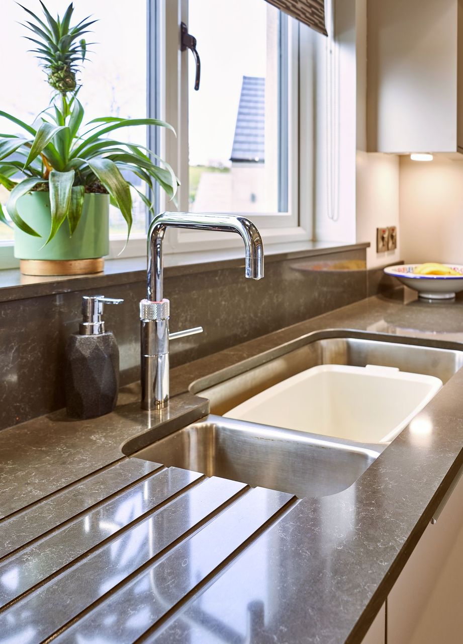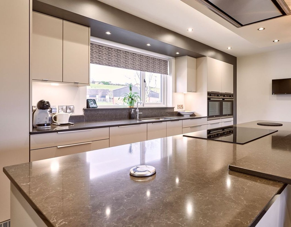 Completed in Athos Brown by Mountfield Kitchens in Omagh this gorgeous kitchen highlights perfectly how TechniStone quartz can be used to great effect in kitchens