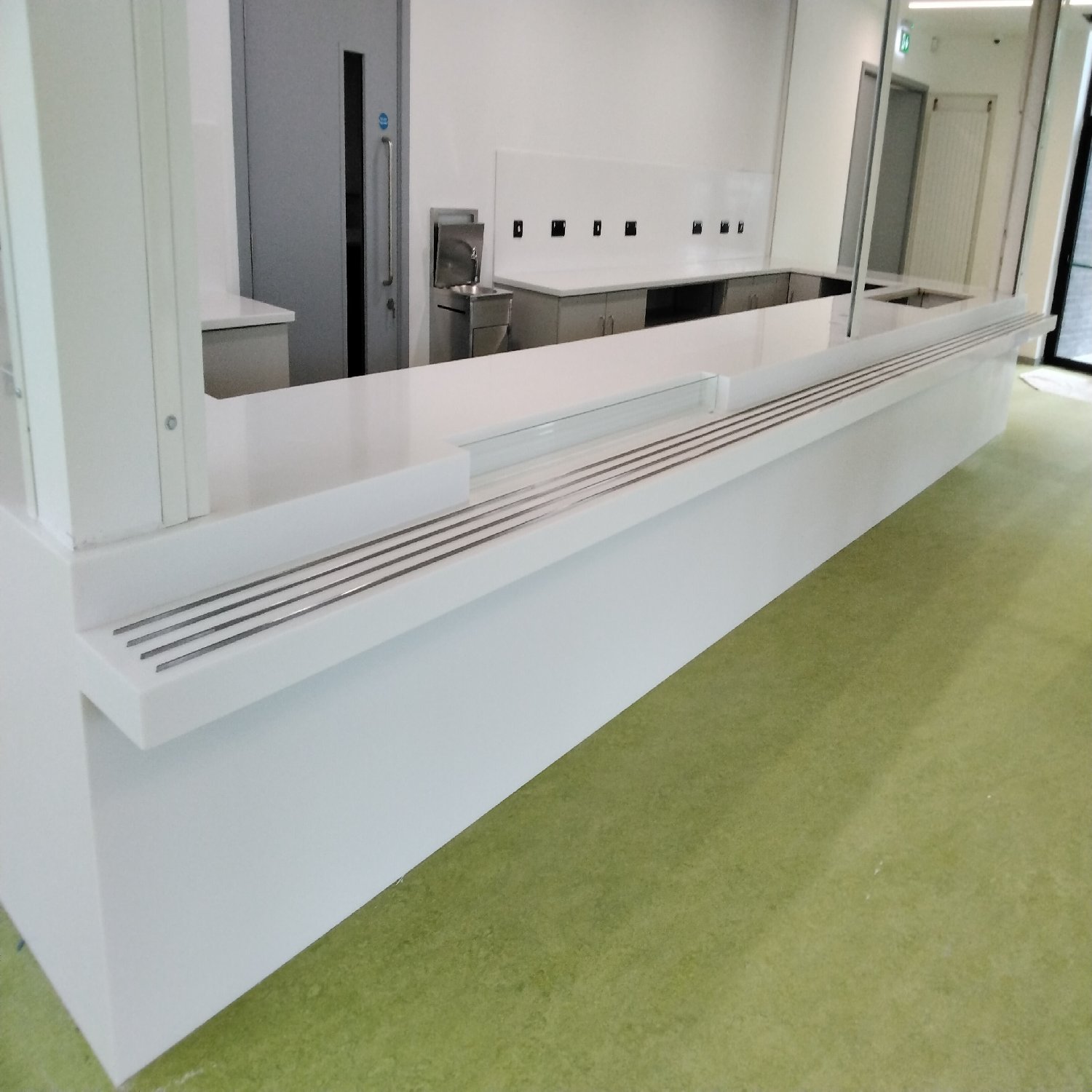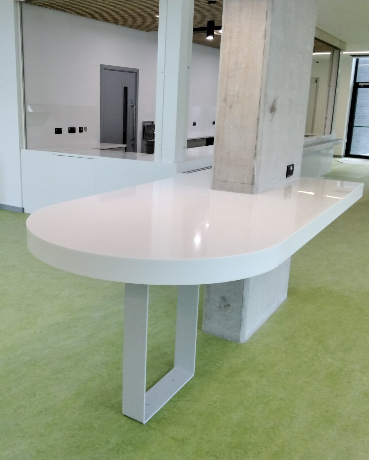 Retail counters experience high volumes of traffic. Durability ad well as attarctive design are important considerations for designers. Solid Surface is the obvious choice for this counter.